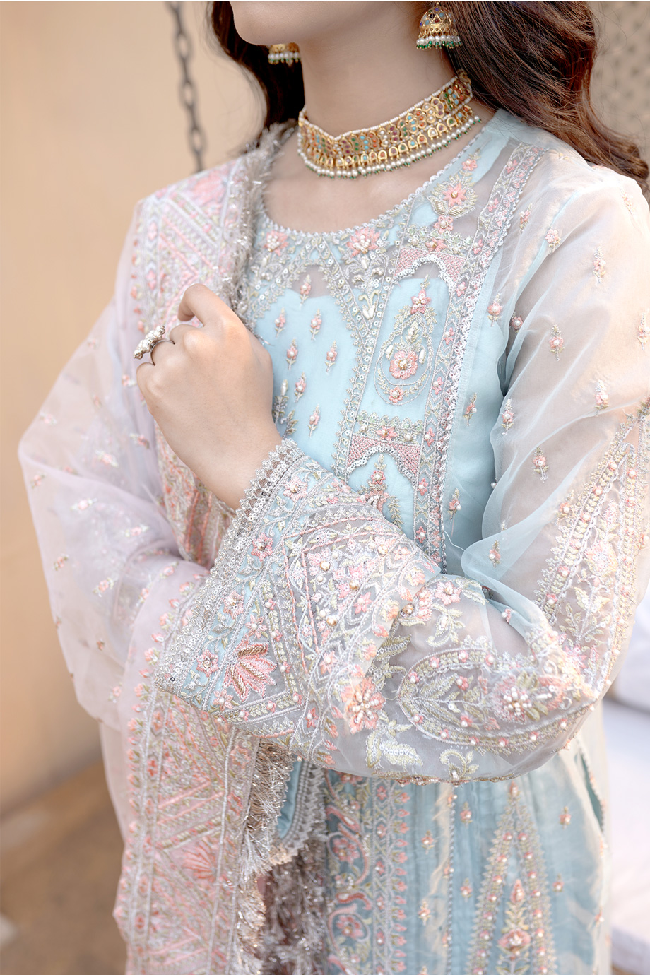 • Embroidered Sleeves Hand Embellished (Organza) 1.5 Yard